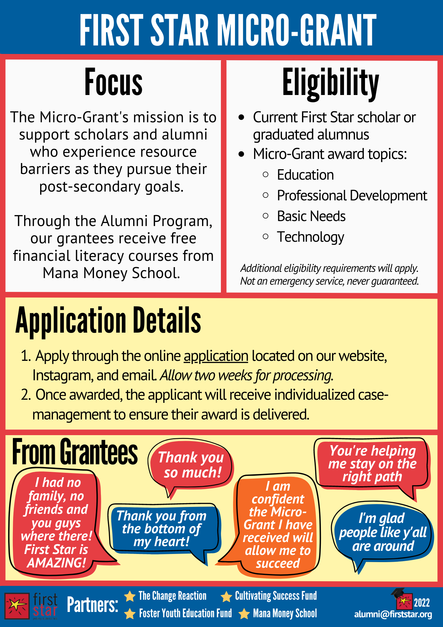 Our First Star Micro-Grants are available for First Star Scholars & Alumni who need grants for technology, education, professional development, and/or basic needs.