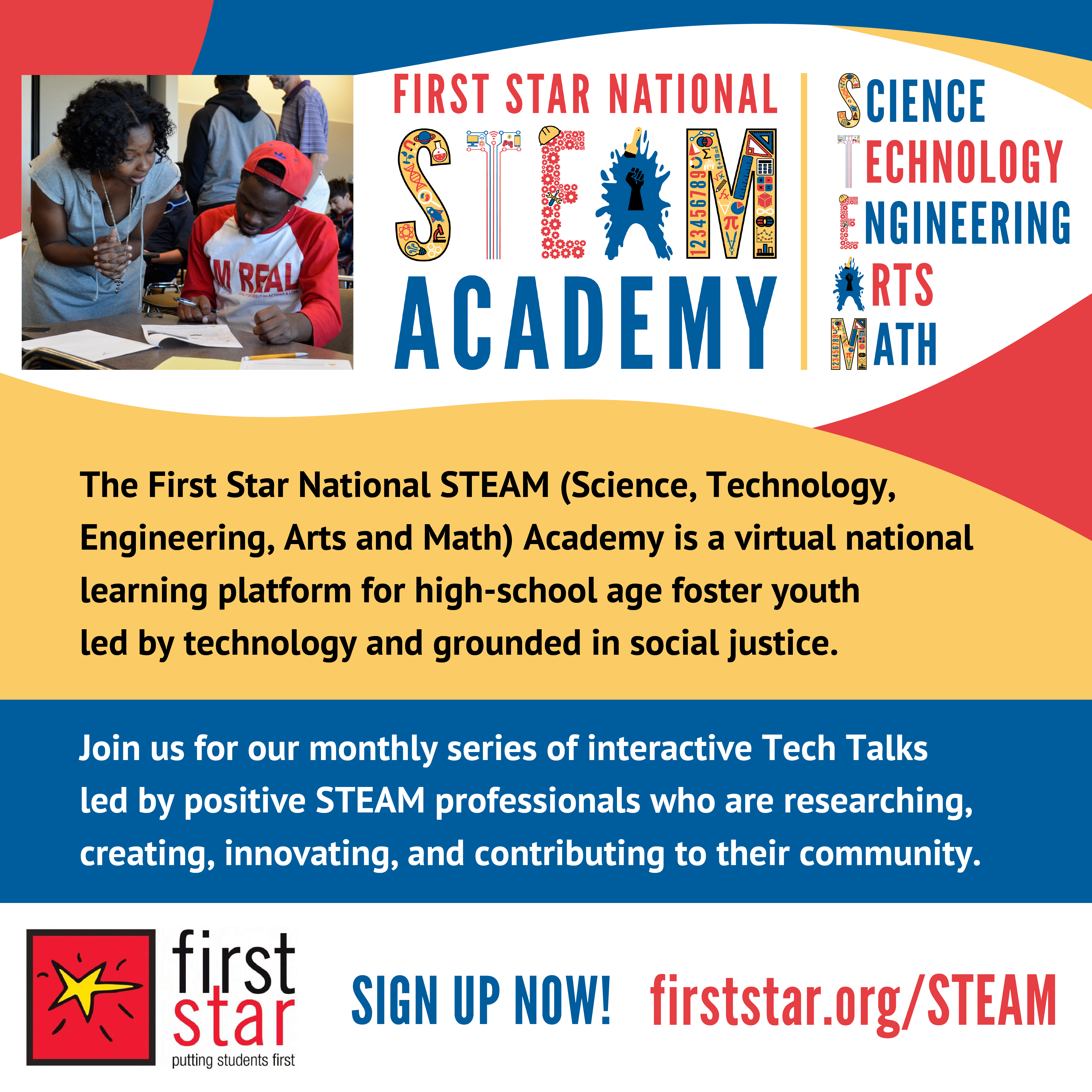 The First Star National STEAM (Science, Technology, Engineering, Arts and Math) Academy is a virtual national learning platform for teens and young adults, led by technology and grounded in social justice.